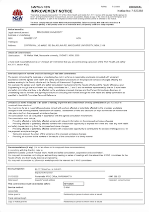 SafeWork NSW has issued Macquarie University with an Improvement Notice after NTEU members raised the alarm on management’s failure to adequately consult those impacted in the latest savage restructure.